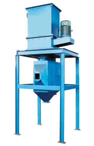 該機可以由若干個結構相同的單元沿垂直方向串連組成。經過凈化和散?;纳白訌氖芰隙仿湎蚪o料盤,再均勻地落入回轉盤,在高速旋轉地回轉盤離心力作用下,砂以30~40m/s地速度被拋向固定地環形擋板。高速砂流沖擊到擋板上,并沿其內壁旋轉,使砂粒間、砂粒與擋板間產生沖擊和摩擦,然后再落入下一個單元的受料斗。如此經過幾個循環,使樹脂膜逐漸脫落,達到再生目的。高速旋轉的風翼使吸入的空氣以高速穿過下落的砂流,帶走粉塵并從上部排入除塵器中。