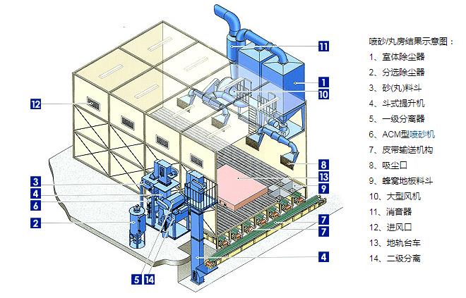 一套完善的噴砂房/噴丸房系統有噴砂/丸房室體、氣源系統、噴砂/丸系統、磨料回收分離系統、通風除塵系統、工件輸送系統、勞動防護系統、照明系統和電氣自動化控制系統等組成;噴砂房/噴丸房主要用于工程機械、橋梁鋼結構、重型機械、集裝箱、機車車輛、航空航天、石油石化、電力、兵器等行業的表面噴砂噴丸處理。公司采用的模塊設計,工廠預制,現場拼裝;結構合理、美觀,并且設計、制造周期可控制在2~3個月內。