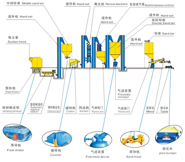 1、生產線的構成:包括落砂系統、破碎系統、再生系統、砂調統、氣送系統、除塵系統等。