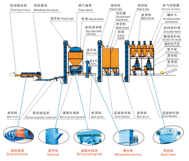 振動輸送機、鑄型輸送、皮帶機、懸掛磁選機、提升機、精六角篩、砂庫、雙向皮帶機、沸騰冷卻床、提升機、再生機、皮帶機、提升機、卸料器、皮帶機、砂庫、圓盤給料機、皮帶機、提升機、皮帶機、排氣呼吸器、輔料斗、雙向給料機、螺旋給料機、輔料電子秤混砂機、皮帶機、圓盤給料機。