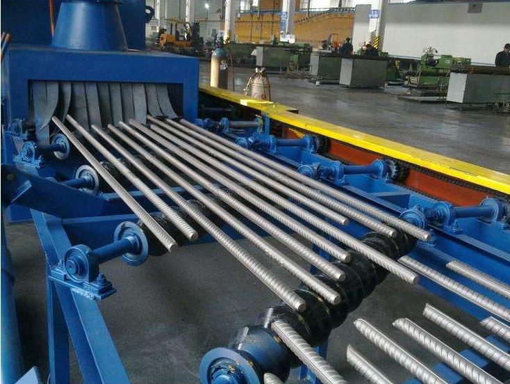 2. 我公司生產的線材拋丸機的除塵器、提升機、底部螺旋輸送器、檢修門等都與拋丸器開啟相關互鎖,當拋丸器依次開啟運行平穩、可靠后,丸料閘門方能拉開,分離器內丸料聯續進入拋丸器,由高速旋轉葉片拋出,打擊線材表面上,清理掉線材表面上的油垢和鐵銹,線材呈現出光亮的金屬光澤。實現線材工件快速輸送以及連續進料、卸料和拋丸等功能.無酸洗環保線材除銹拋丸清理機該線材拋丸機集無酸洗、環保、節能、高效、使用便捷等優點于一身,其主要功能是非酸洗清除線材表面的氧化皮、油垢及銹垢,使線材表面獲得良好的清理效果,同時還具有消除線材內應力,提高線材表面抗疲勞強度,延長使用壽命等特點,消除了線材酸洗除銹對環境造成的污染及對人身體造成的傷害。